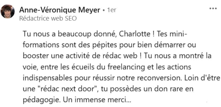 C’était il y a 8 ans.👵L’eau a coulé sous les ponts, le marché a changé, les rédacteurs web ont été de plus en plus nombreux. Pour ma part, en parallèle de mes clients en rédac’, j’ai aussi été coach chez Formation Rédaction Web (oui, oui, l’organisme de la papesse du secteur Lucie Rondelet😎) et mentor indépendant auprès de plusieurs dizaines de freelances.