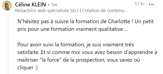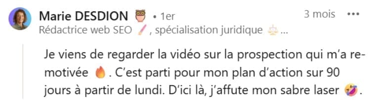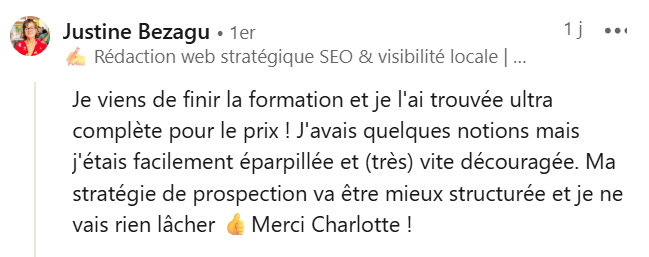 Oui ! Prospection Jedi ne se focalise pas sur les compétences métier, mais bien sur la partie entrepreneuriale de l’activité de rédacteur.rice web SEO freelance. La formation est donc complémentaire au cursus que tu es en train de suivre. Cela dit, même si dans ce dernier, tu as une partie orientée business, le fait d’avoir un autre point de vue (=le mien via Prospection Jedi) te permettra d’avoir un maximum de cartes en main pour signer tes premiers contrats.