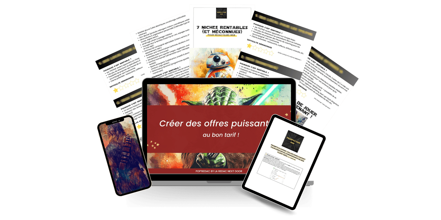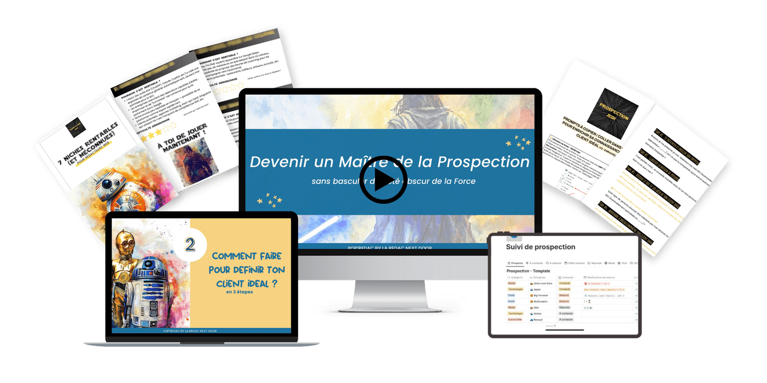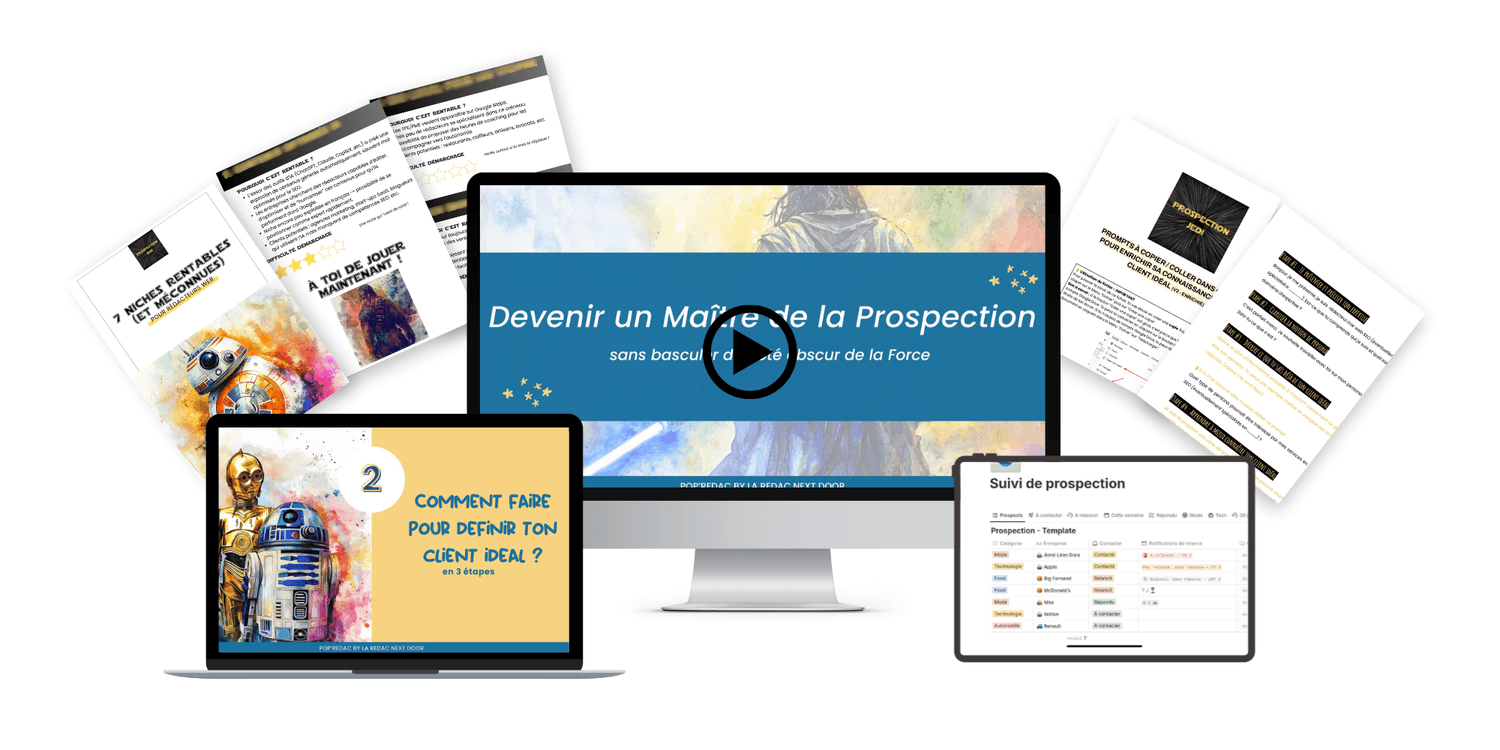 La bonne nouvelle, c'est que si tu appliques Prospection Jedi, tu auras toutes les clés en main pour démarcher efficacement. Tu n’auras pas à subir la concurrence (des autres rédacteurs web ou de l’IA) ou à attendre inlassablement qu’un client vienne miraculeusement frapper à la porte de tes MP😉